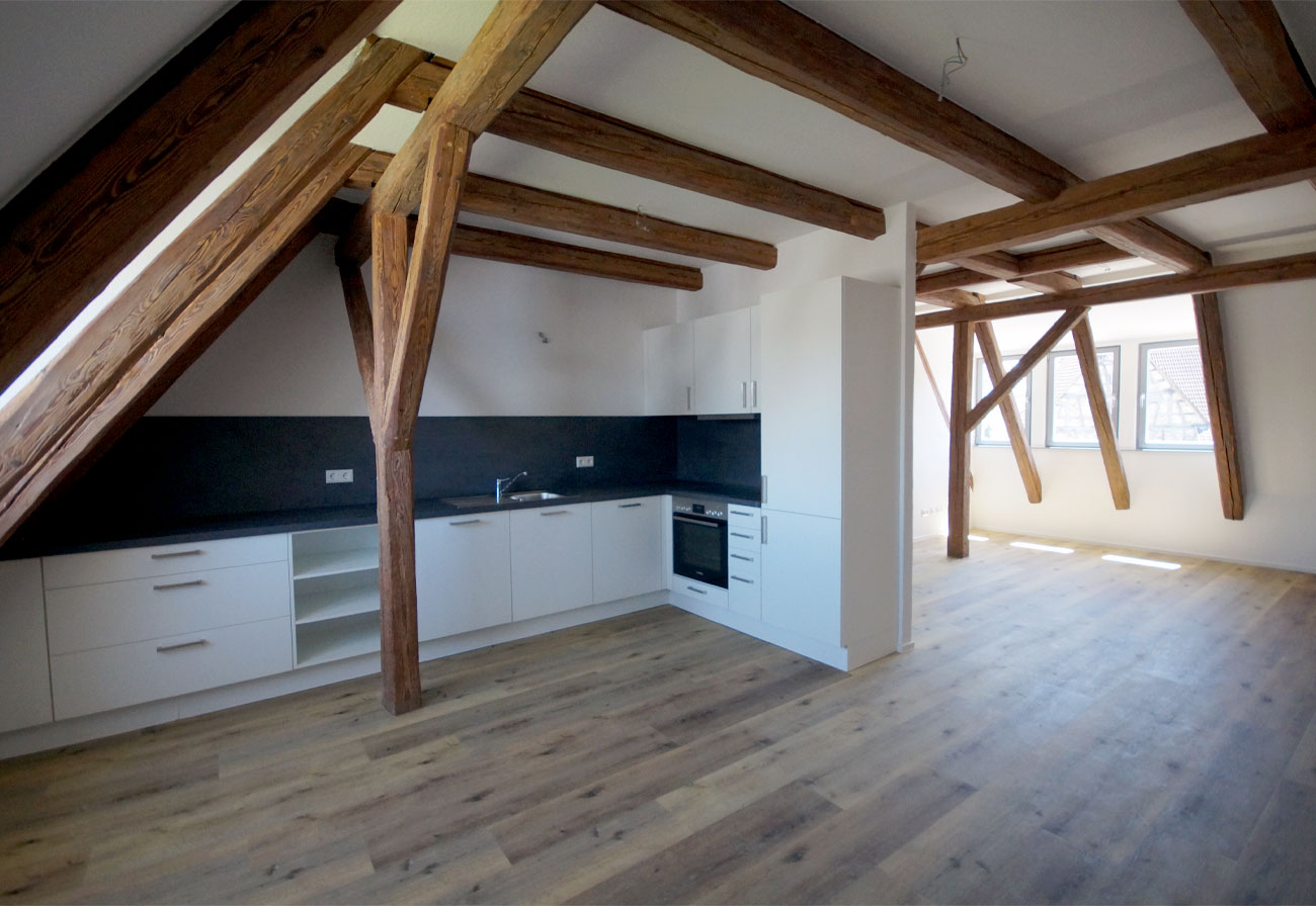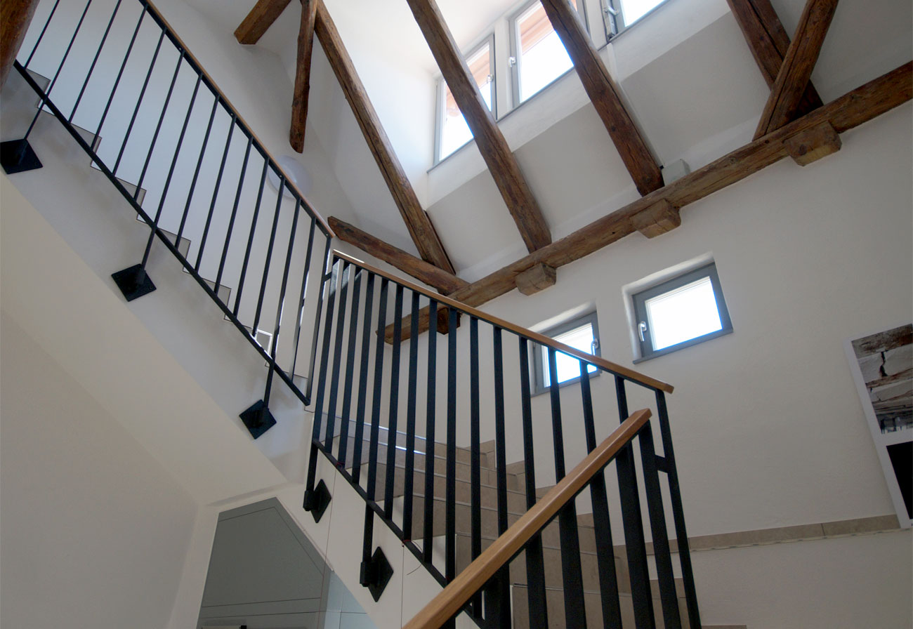 Die denkmalgeschützte Scheune im Ortskern fand durch die Sanierung und Umnutzung zu einem Wohngebäude zu neuem Leben. Auf insgesamt vier Wohnetagen wurden 5 Maisonetten-Wohnungen eingebaut.